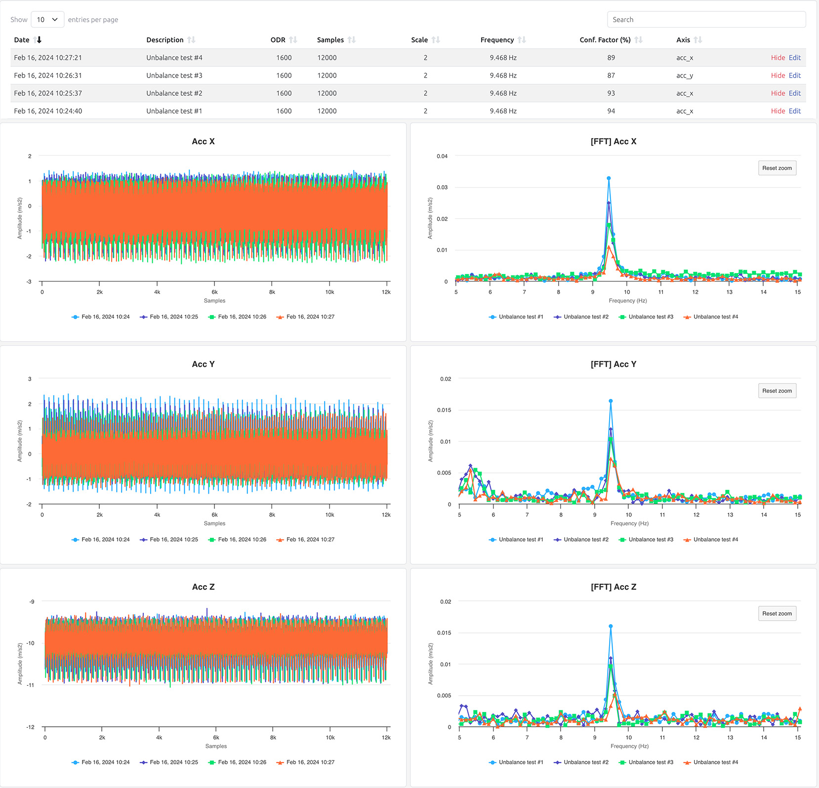 In the web portal, we selected the four waveforms acquired during the four test runs. Test #4 showed the highest unbalance, while test #1 involved complete removal of the thread and nuts. Clear observation reveals that the amplitude at 9.4Hz consistently decreases with each weight removal.